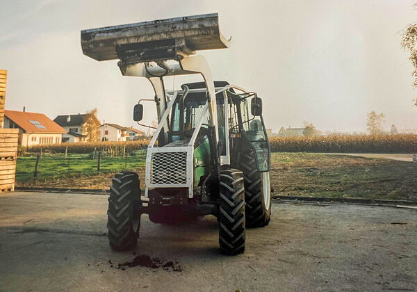 À l'époque : une Valmet 655-4 à Vinelz, dans le Seeland, avec chargeur frontal et protection forestière sur le capot.