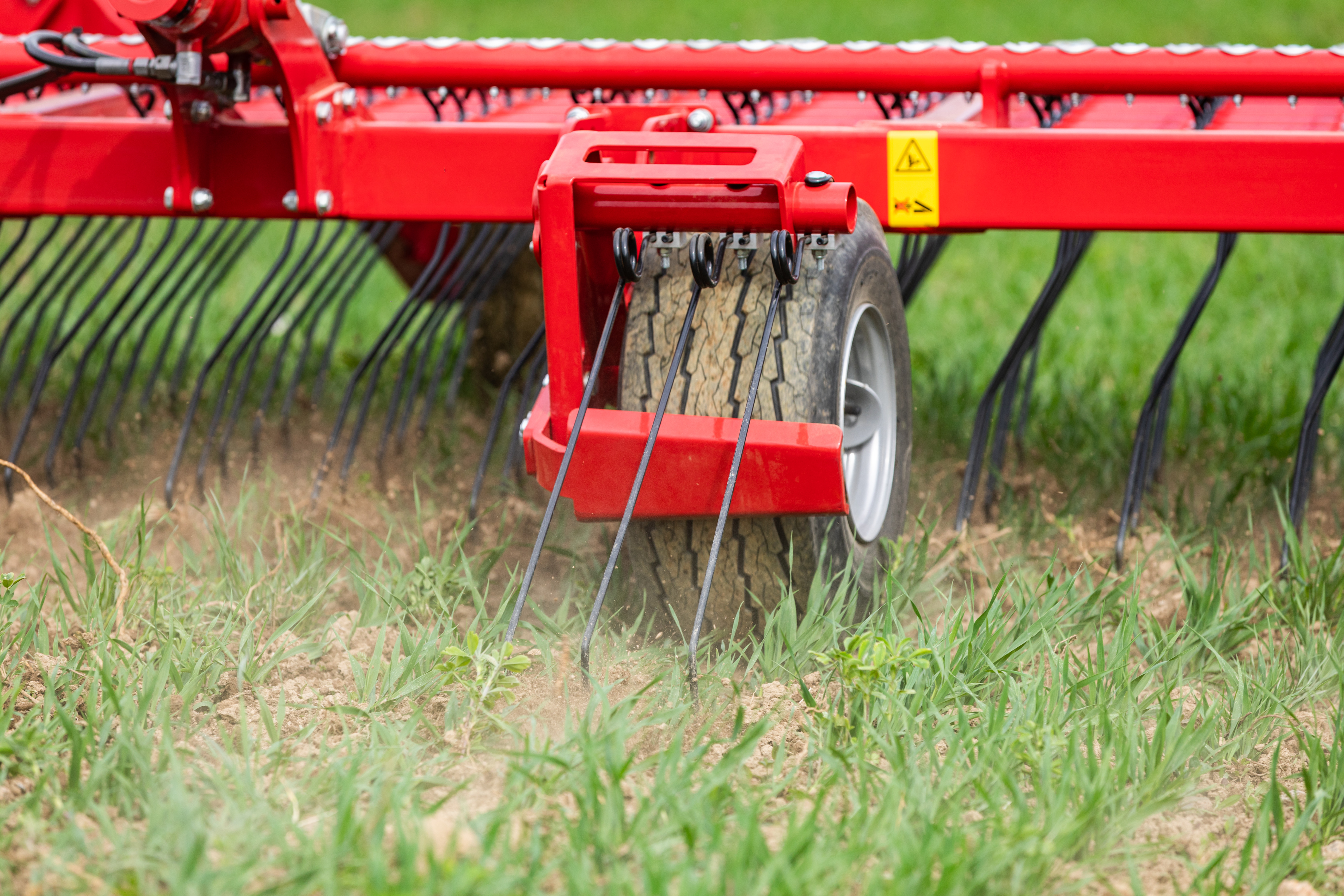 Chaque dent est fixée individuellement sur un support large évitant tout déplacement latéral. Cela garantit un travail de précision élevé. Les dents sont coudées pour une application centrale de la force, afin que la dent suive constamment sa trajectoire. Leur agressivité est réglée par la position des 11 roues de jauge fixées sur le châssis. Les modèles Cura 12 – 15 ST peuvent recevoir jusqu'à onze roues de jauge et en option et être équipées d’efface-traces.