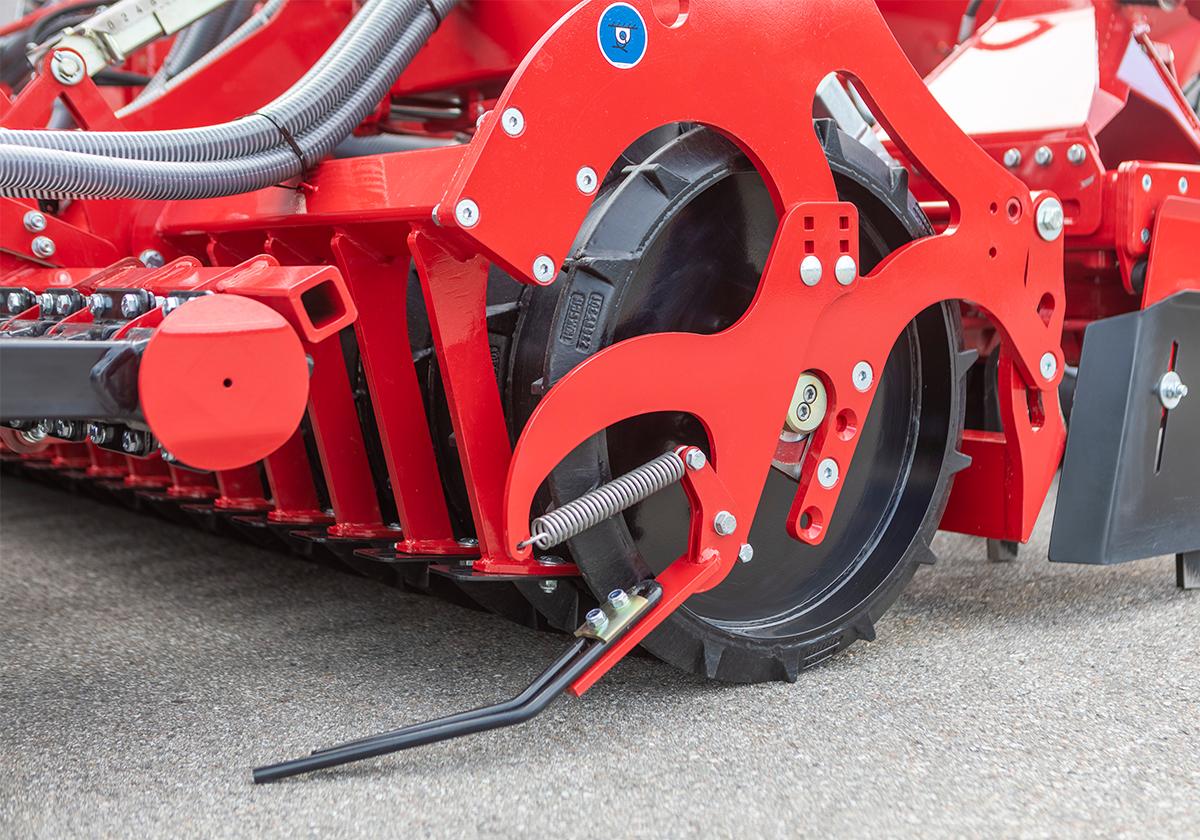 Le nouvel agencement de herses rotatives de 6 m offre quatre zones de travail distinctes. Le packer à pneus, en amont, réduit les ornières et répartit le poids de la machine sur toute la largeur de travail. La herse rotative assure une production optimale de terre fine. La combinaison du packer et des socs semeurs TurboDisc garantit une dépose précise de la semence. L’écartement des éléments semeurs peut être de 12,5 ou 15 cm.